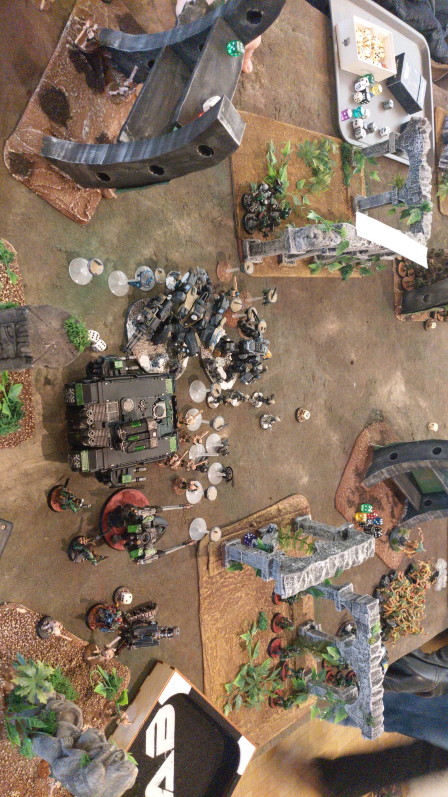 Runde zwei wurde jedoch zum Fiasko und eine starke Dämonen+Tyraniden Kombo eroberte das Feld von Beginn an und schlug sie vernichtend. Eine späte Wiedergutmachung in der dritten Partie gegen Fists mit Necrons führte am Ende noch zu einem soliden 28. Mittelfeldplatz, nachdem die generischen sensiblen Einheiten erfolgreich weggebunden werden konnten und Marcs Snotzogga einmal mehr ausrastete.Pascal und Daniel setzten als Team BSK – Chapter Wowse auf eine etwas ungewöhnliche Tau Liste in Verbund mit einer IronHands Ballerburg. Nach einem sehr interessanten Auftakt gegen oben genannte Dämonen und Tyraniden Liste, das zeitlich knapp verloren gegeben werden musste, kam in zweiten Spiel die ebenfalls oben genannte WhiteScars+Tauliste. Nachdem die Tau in einen Hinterhalt gelockt wurden und damit sämtliche Optionen einbüßten rollten die WhiteScars schließlich die Ironhands vom Flügel her auf, so dass die Partie mit einer brutalen Niederlage endete. Im letzten Spiel konnte man sich ungefährdet rehabilitieren und eine Ork/Necron Kombination vernichtend schlagen.