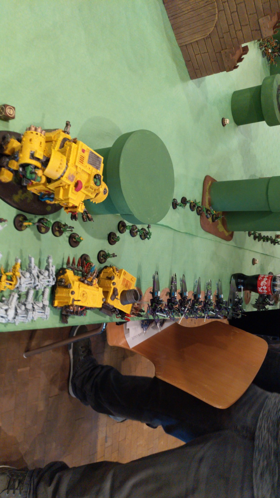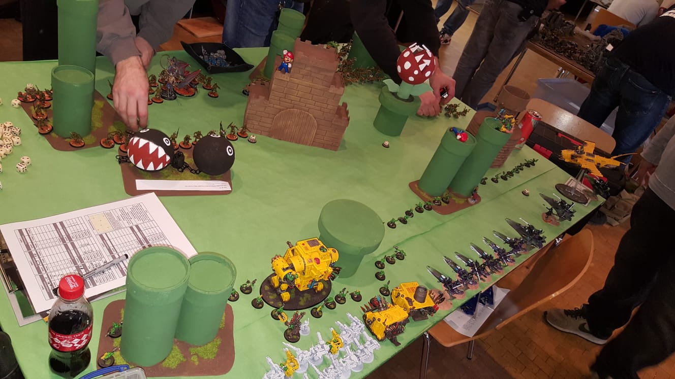 Am gestrigen Tag fand das erste große Event in diesem Jahr statt. Die Bergische Spielkultur war natürlich anwesend und stellte mit insgesamt 5 Teams (da es sich um ein Tagteam-Turnierhandelte 10 Personen) abermals die größte Vereinsbeteiligung. Fast 10% der gesamten 104 Spieler stammten aus unseren heiligen Hallen.Marc und Tim traten als BSK-Besonders Schöne Knaben mit einer Ork-Harlequins Kombination an. Im ersten Spiel konnten sie dank ihrer Mobilität und einigen guten Treffern eine WhiteScars+Tau Liste in Schach halten und am Ende knapp besiegen.